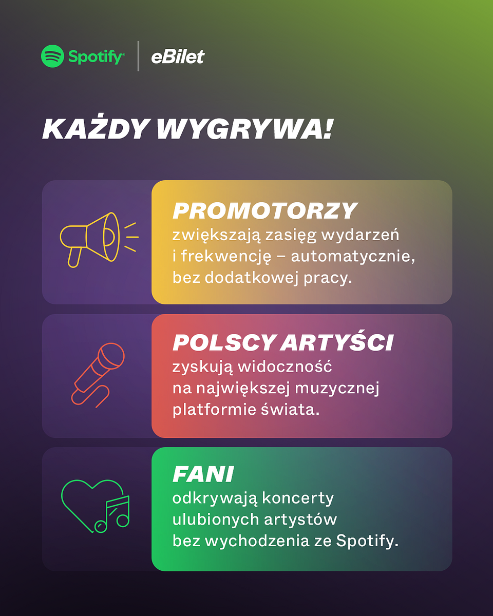 To partnerstwo wpisuje się w strategiczny kierunek rozwoju eBilet jako lidera w obszarze event tech, poprzez tworzenie nowoczesnych, technologicznych rozwiązań, które pomagają łączyć promotorów wydarzeń z fanami, a fanów z rozrywką. To realna szansa, by promować koncerty tam, gdzie zaczyna się zainteresowanie artystą - w miejscu, w którym fani słuchają, szukają i planują swoje muzyczne przeżycia